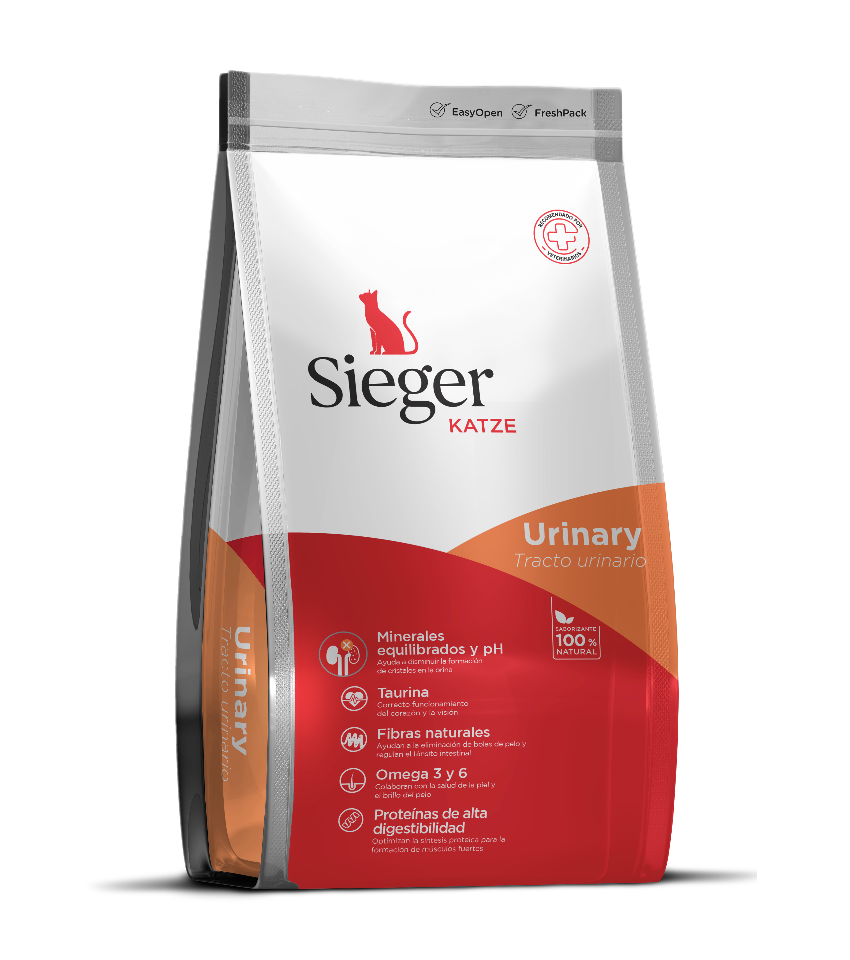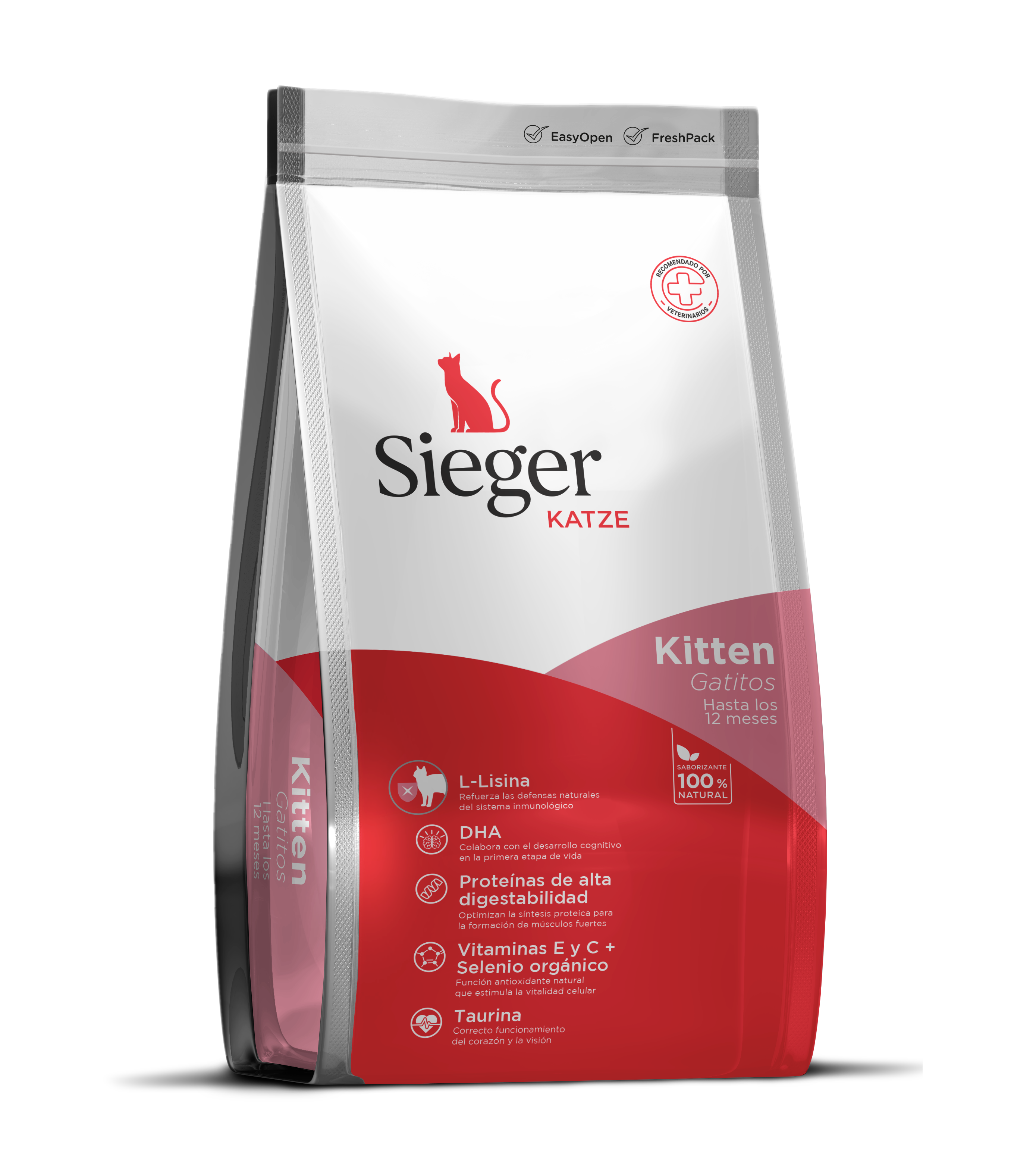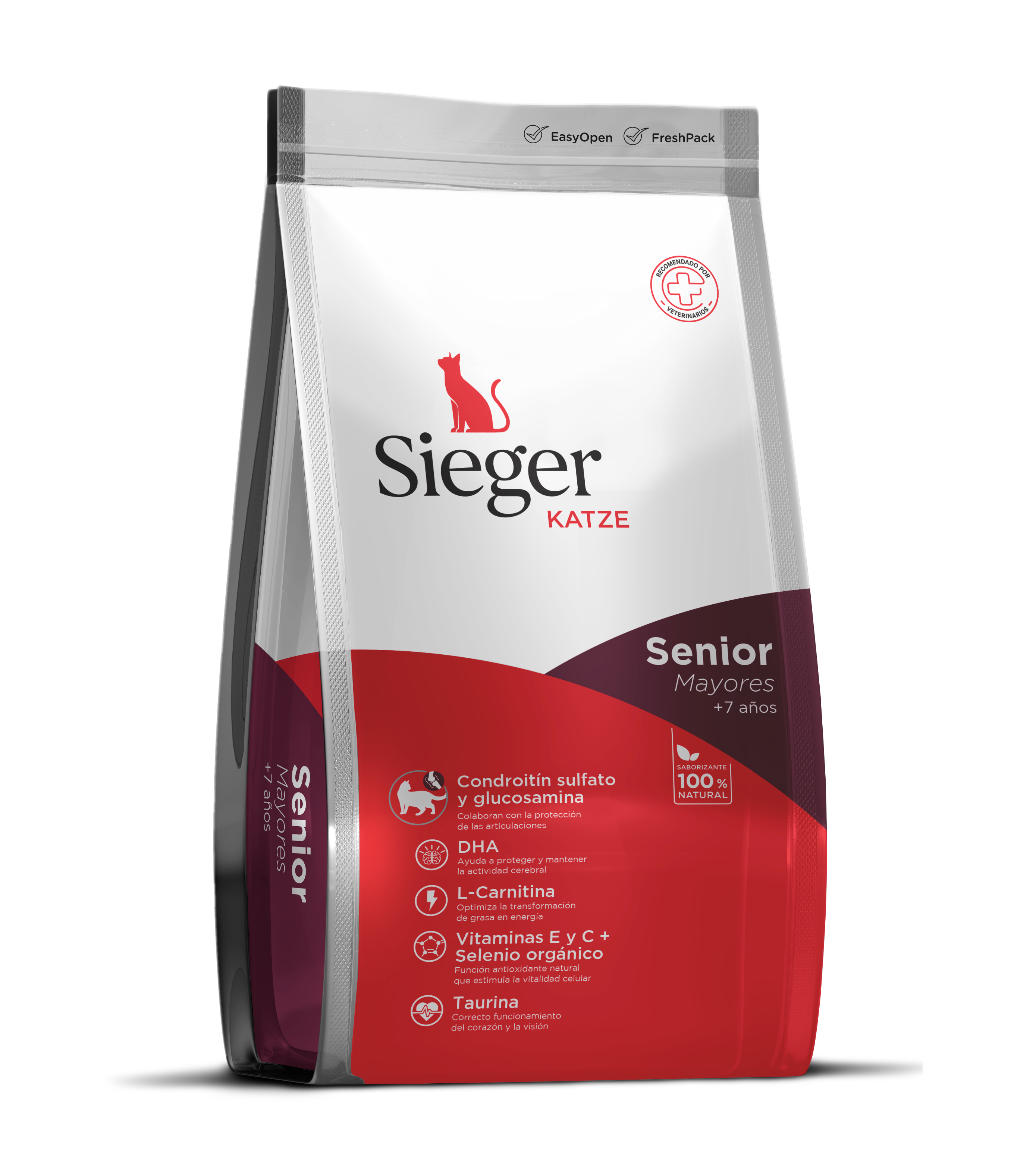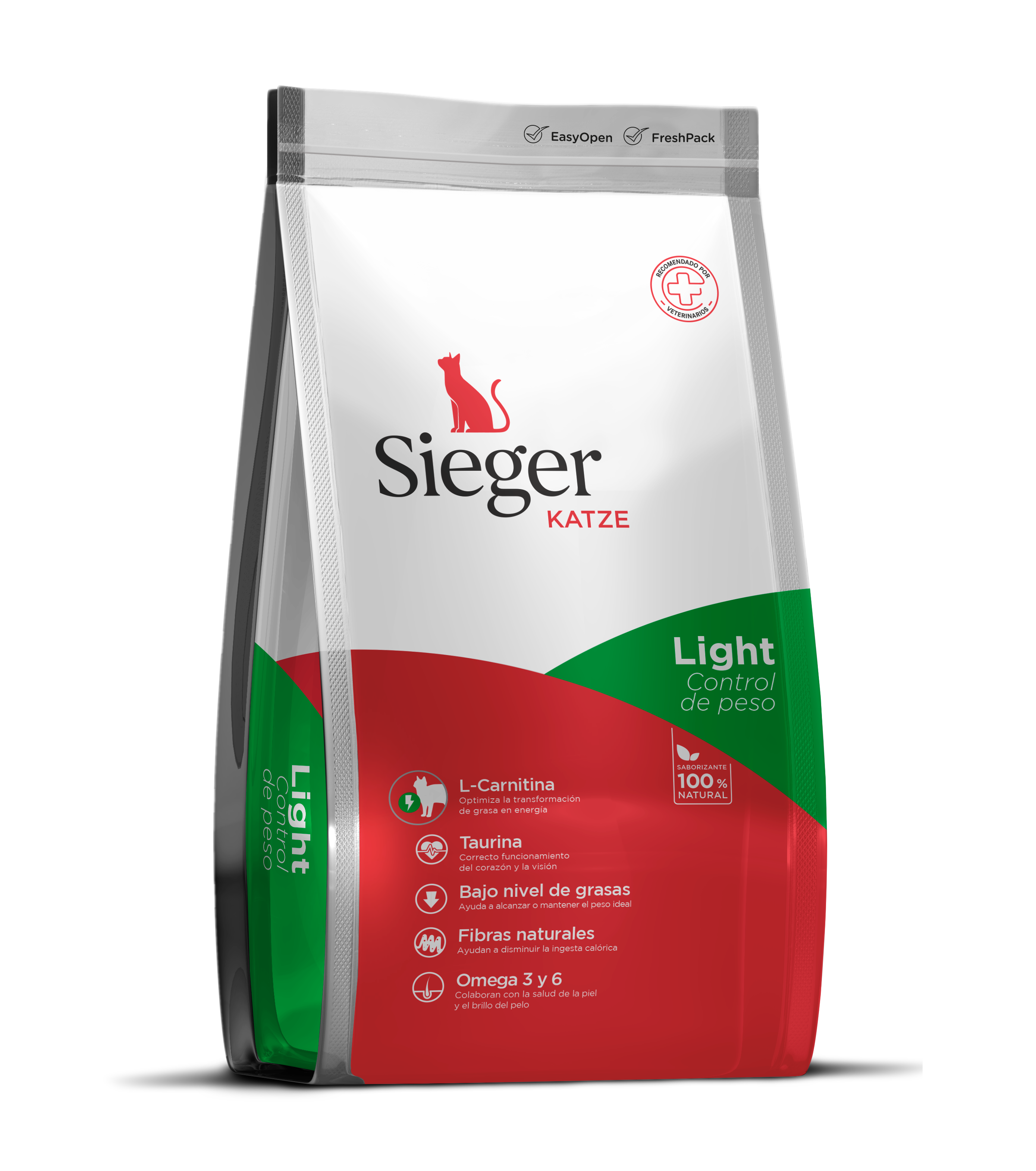 Para el lanzamiento de la nueva línea de alimento para gatos de Sieger, marca que hasta ahora sólo tenía línea para perros, se desarrolló una identidad de marca que se inició desde el diseño de los packs. Para diferenciar la marca se utilizaron curvas que siguen el estilo de la marca de diagonales, pero le dan una línea más suave y el color principal pasó de ser negro a blanco. De esa forma se logró una relación entre ambas líneas, pero con una identidad propia en cada una.