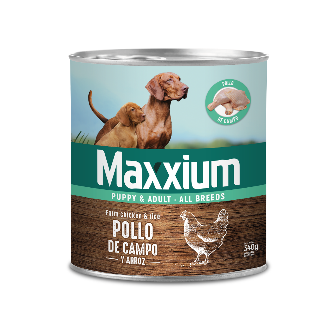El diseño renovado de Maxxium captura la esencia de su promesa de frescura y naturalidad. Los nuevos empaques, como se observa en la imagen, presentan fotografías de alta calidad de perros en entornos naturales que reflejan la vitalidad y el bienestar que la marca busca promover. Cada variedad de producto se distingue por un color específico y sutil, asegurando una diferenciación clara y atractiva en los estantes: verdes naturales para el pollo de campo, azules serenos para la trucha patagónica, y tonos tierra para el cordero patagónico.